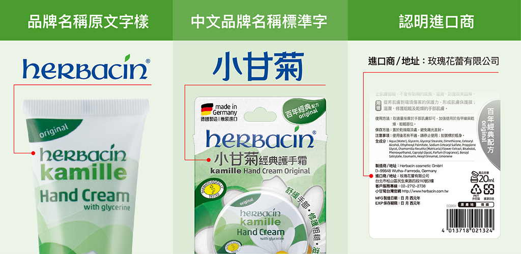 其他品牌護手霜,宣稱含「小甘菊」配方,可能只添加洋甘菊配方,並非主要成分,當然不是 herbacin 小甘菊品牌的產品。
