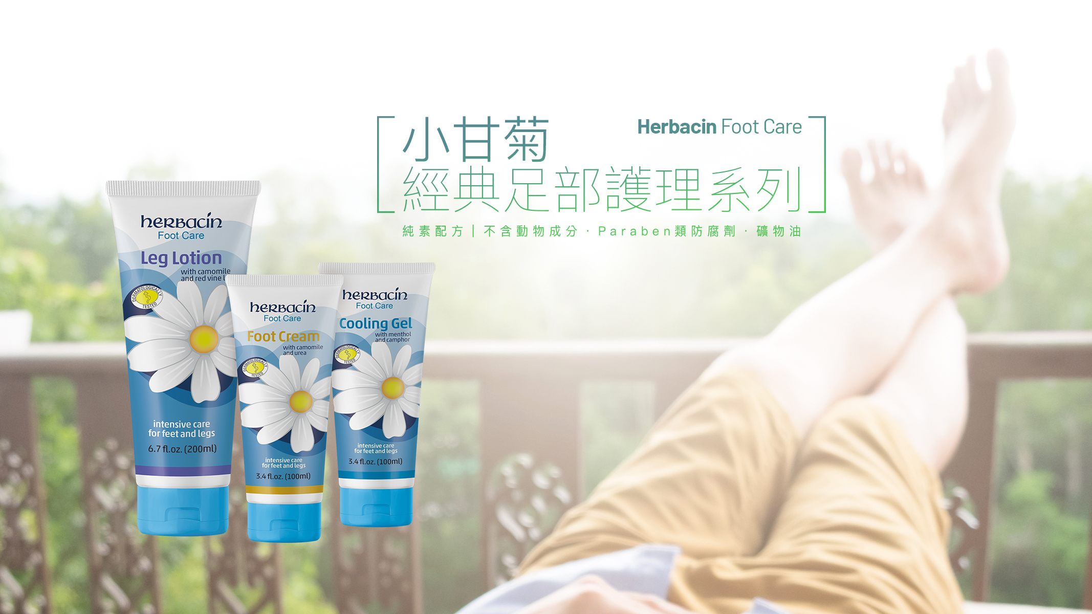 德國小甘菊全方位的經典足部護理系列,以天然的成分及先進的配方,為腿部及足部提供舒緩、滋潤功效。